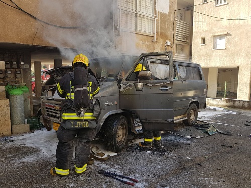 צוותי כיבוי וחילוץ פועלים בשריפת רכב עם מעורבות בלוני גז בחניית בניין מגורים ברחוב הנשיאים בפתח תקוה.